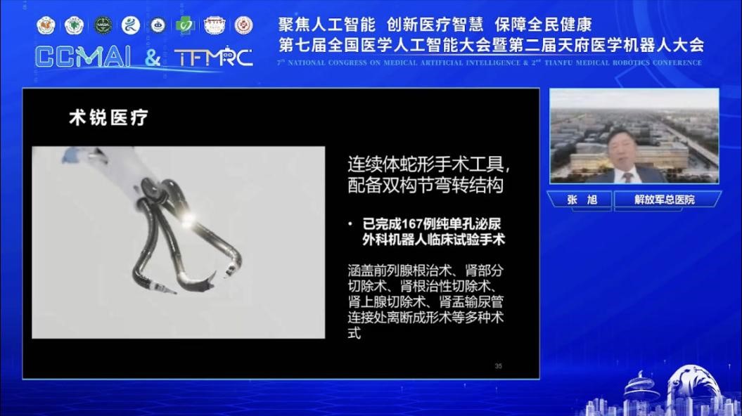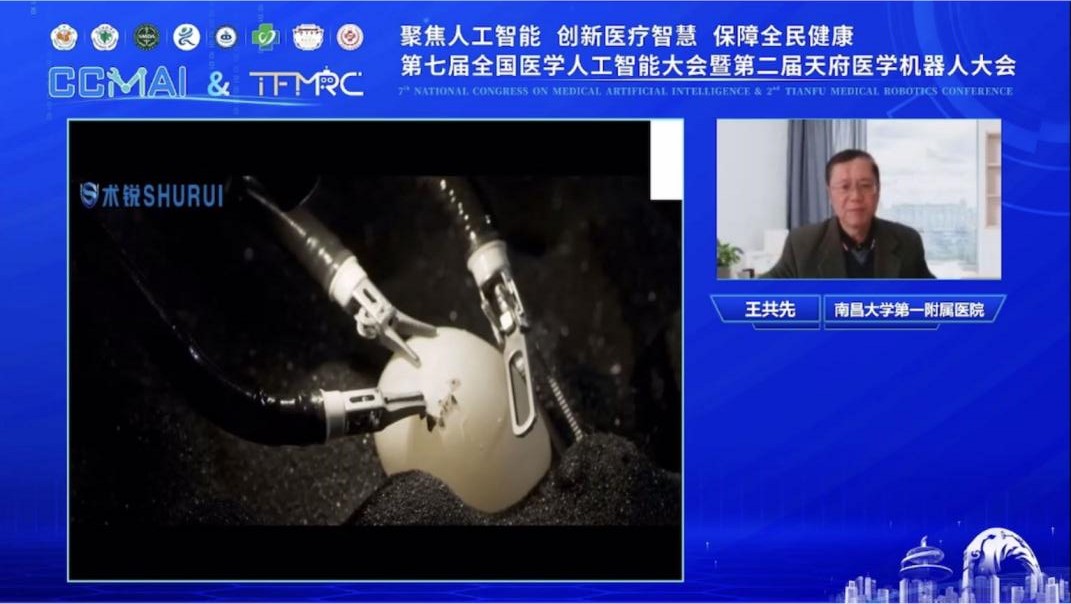 2022年12月30日上午,由中华医学会指导,四川省医学会主办的“第七届全国医学人工智能大会暨第二届天府医学机器人大会”顺利开幕。来自全国各大顶尖医院的专家教授们相聚云端,共话医学人工智能高质量发展的未来方向。作为创新医疗器械前沿技术的代表,北京术锐技术有限公司自主研发的术锐单孔手术机器人在本次大会上成为了专家们探讨、分享的热点话题。中国科学院院士、解放军总医院泌尿外科医学部主任张旭教授,上海长海医院泌尿外科主任王林辉教授,浙江大学医学院附属第一医院夏丹教授,南京医科大学第二附属医院朱清毅教授和南昌大学第一附属医院王共先教授均对术锐单孔腔镜手术机器人进行临床应用的经验进行了分享。