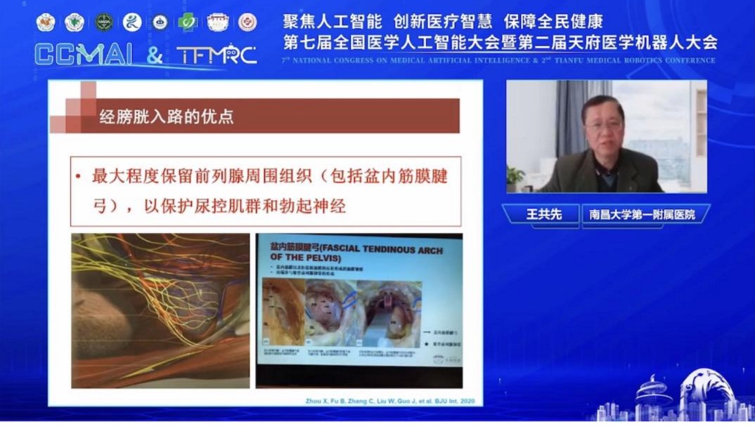 最后,南昌大学第一附属医院王共先教授在会上分享了《机器人经膀胱前列腺癌根治术:不断探索之路》的主题演讲。王共先教授分享道,经研究表明,经膀胱入路的前列腺癌根治术可最大程度保留前列腺周围组织(包括盆内筋膜腱弓),以保护尿控肌群和勃起神经。因此,术者依然需要在已有多种入路方式的情况下探索经膀胱入路的前列腺癌根治术。通常情况下,通过多孔腔镜机器人模拟的单通道入路方式由于其机械臂的直杆型设计,容易出现“筷子效应”增加了医生的操作难度,而单孔手术机器人凭借单通道及蛇形臂的灵活操作,很好地解决了这一难题。令人欣喜的是,术锐单孔手术机器人与王共先教授共同合作开展的经膀胱入路前列腺癌根治术已成功完成首例人体手术,这不仅标志着术锐在泌尿外科微创手术领域取得突破,更意味着创新医疗技术真正实现了造福患者。