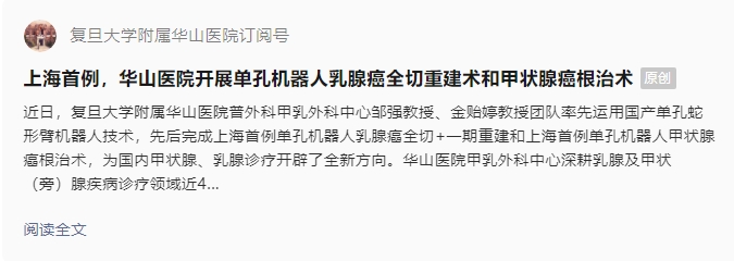 上海首例,华山医院开展单孔机器人乳腺癌全切重建术和甲状腺癌根治术