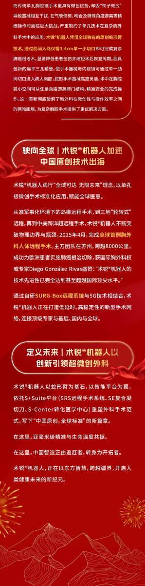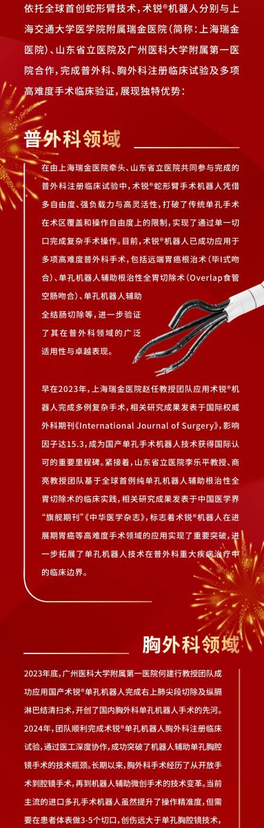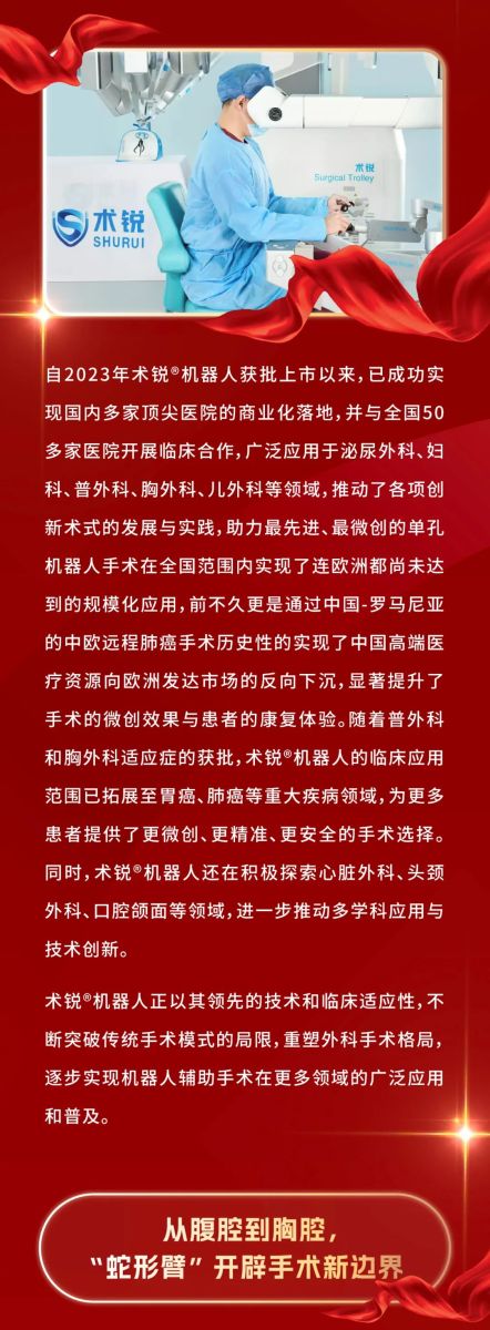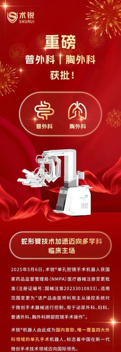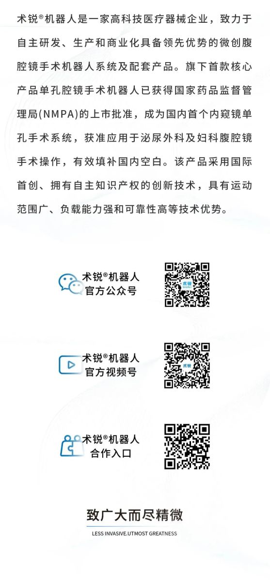 北京术锐机器人股份有限公司的腹腔内窥镜单孔手术系统 已 获得国家药品监督管理局( NMPA)的上市批准(注册证号:国械注准20233010833), 用于泌尿外科及妇科 腹腔镜手术操作 。医生若希望学习术锐 ®机器人的手术操作,请联系北京术锐 机器人股份 有限公司,参加术锐的官方培训计划。患者若想参加术锐 ®机器人的注册临床试验,请联系术锐官方合作医院,咨询医生,以确定是否适合术锐®机器人的手术。医生和患者应仔细了解有关术锐®机器人执行手术及其可能风险的所有信息。