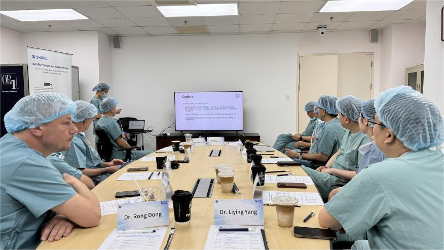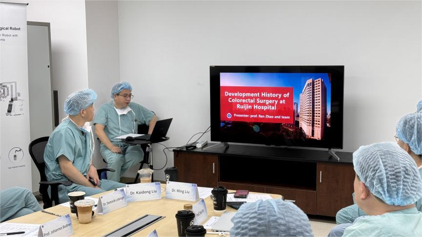 随后,瑞金医院普外科刘坤副主任医师向来访专家介绍了瑞金医院的发展历程、普外科建设情况及机器人微创手术的整体布局。他重点分享了瑞金在术锐®机器人平台上的多学科探索成果,包括在胃肠、直肠、肝胆等复杂部位手术中的关键技术经验与操作策略。赵任院长表示,随着国产手术机器人不断成熟,瑞金医院正加快建立标准化、系统化的机器人手术培训与评估体系,助力国产设备高质量走向国际。