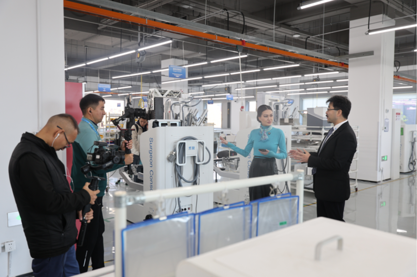 10月21日上午,参与“魅力北京”系列电视片海外传播活动的俄罗斯和哈萨克斯坦摄制组来到了位于北京市大兴区的术锐机器人创新中心和生产制造基地,详细了解了术锐机器人在单孔腔镜手术机器人领域的技术突破与临床应用成果。